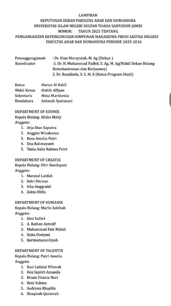 Pada Rabu 17 September 2025 Badan Pengurus Harian HMP Prodi Sastra Inggris periode 2025-2026 resmi dilantik. Pelantikan ini dilakukan oleh Kaprodi Sastra Inggris Dr. Rosalinda M.A dengan disaksikan oleh Dekan Fakultas Adab dan Humaniora beserta Wakil Dekan Bidang Kemahasiswaan.