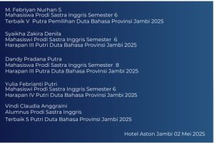 Mahasiswa Sastra Inggris Fakultas Adab dan Humaniora kembali meraih prestasi yang membanggakan dalam ajang bergengsi Pemilihan Duta Bahasa Provinsi Jambi 2025. 4 orang mahasiswa dan 1 alumni berhasil masuk sebagai finalis di malam pemilihan. Kegiatan tahunan ini dilaksanakan oleh Kantor Bahasa Provinsi Jambi di Hotel Aston pada hari Jumat 2 Mei 2025. Raihan prestasi berupa juara harapan dan terbaik lima menjadi capaian prestasi yang berhasil diraih oleh mahasiswa. Berikut daftar prestasi dalam pemilihan tersebut